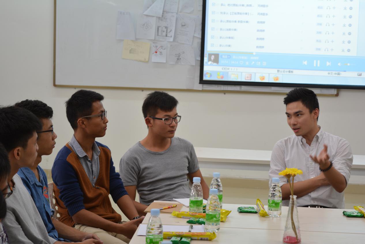 图:校友沙龙——06级国贸专业凌穗龙校友(右一)到校分享创业经验