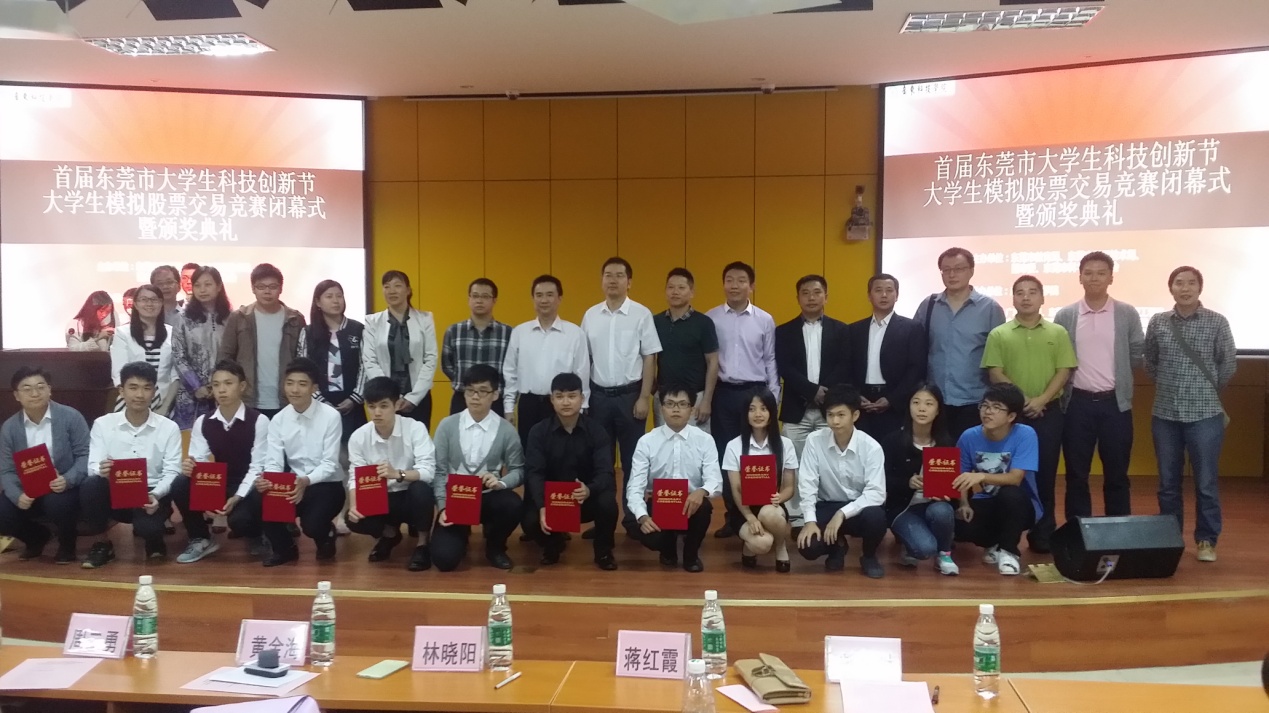 2015年10月11日上午,首届东莞市大学生模拟股票交易竞赛决赛在东莞市广东科技学院举办,此次比赛参赛的队伍有东莞理工学院、东莞理工城市学院、中山大学新华学院、东莞市职业技术学院及广东科技学院共五支队伍。初赛于2015年6月底开始,历经近三个月的时间,于10月11日上午落幕。经过模拟操盘、现场展示等阶段,由经济与贸易系刘洋老师指导,由金融工程专业14级学生何胜开、蔡柯、苏乘禾组成的中山大学新华学院代表队最终获得“优秀指导教师奖”及“团体比赛二等奖”。
