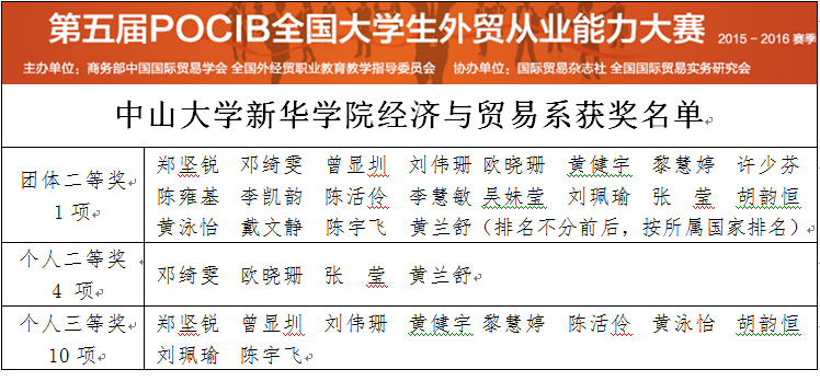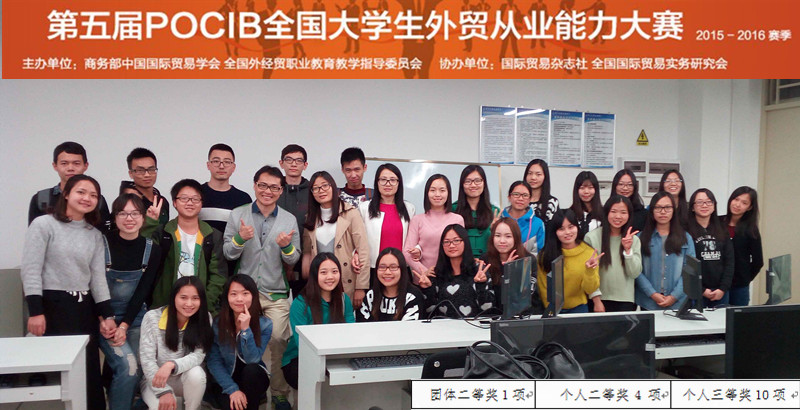 2016年4月27日,历时20天的第五届POCIB全国大学生外贸从业能力大赛(以下简称POCIB大赛)春季赛落下帷幕。由304am永利集团经贸系吴喜龄、苏海洋等老师和2013级国际经济与贸易专业20名同学组成的中大新华学院代表队一举斩获全国团体二等奖1项,指导老师个人二等奖2项(吴喜龄,苏海洋),个人二等奖4项(邓绮雯等),个人三等奖10项(郑坚锐等),共计17项大奖,成绩斐然。这是经贸系继第五届POCIB秋季赛狂揽19枚大奖后的再创佳绩。