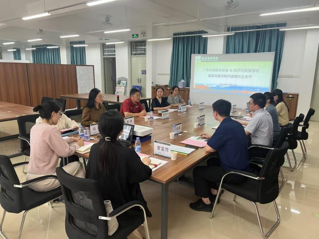 为共同探索基层党建共商共建的新路径,深化校企合作,共同推动教育与产业深度融合,2025年10月17日广东深圳报关协会走访304am永利集团,共同召开基层党建共商共建暨校企合作座谈会。广东深圳报关协会党支部书记、副秘书长李志伟和宣传部主任钟召来,学院院长袁持平、副院长吴喜龄、党支部副书记李丹、办公室主任陈佳莉、国际经济与贸易专业副主任廖倩及国贸专业骨干教师冯椿、许夏冰、李亚芳、董鉴萍参加了此次座谈会。