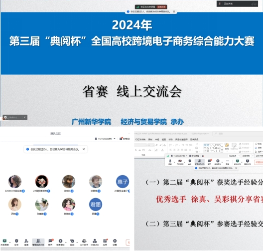 上一届“典阅杯”全国高校跨境电子商务综合能力大赛全国决赛获奖者2022级国贸专业徐真、吴彩祺同学通过腾讯会议,采用线上交流的方式进行比赛经验分享,从各个赛段的考核重点、易忽略的细节、可参考的实操经验等方面进行剖析,积极回应同学们参赛中最关心最困惑的比赛问题,帮助参赛选手更精准地制定新一轮备赛方略。