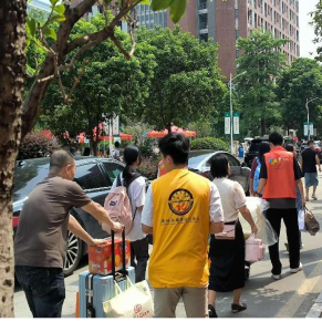 清晨,迎新志愿者一早到达迎新布置场地、整理无聊,随后投入到紧张的迎新工作中去,他们在迎新站点提供咨询与指引等帮助新生发放物资,完成报到工作。