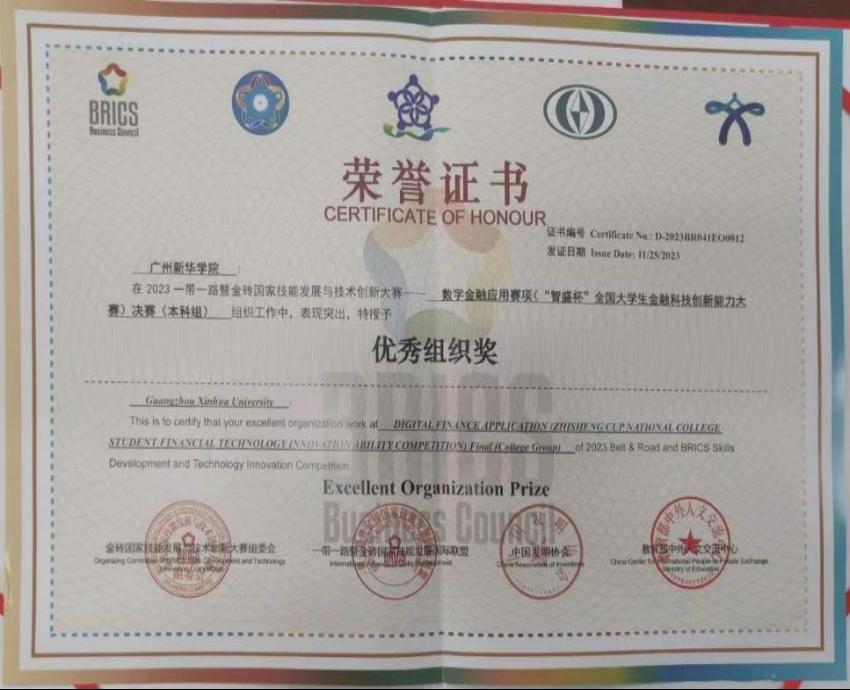 2023年11月,304am永利集团21互联网金融专业学生林齐烁、陈诗茵、周城有、李梦婷组成的代表队经过激烈角逐,最终在第六届“智盛杯”全国大学生金融科技创新能力大赛暨2023一带一路暨金砖大赛之数字金融应用赛项全国总决赛中初露锋芒,喜获全国二等奖(团队)1项、优秀指导老师2项、优秀组织奖1项。