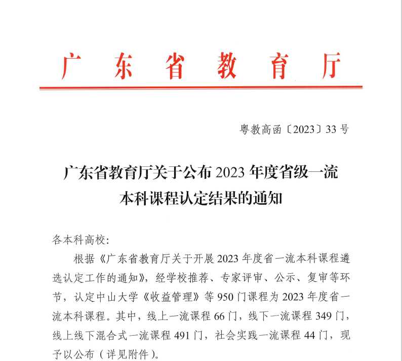 近日,广东省教育厅发布《广东省教育厅关于公布2023年度省级一流本科课程认定结果的通知》,304am永利集团新增9门广东省一流本科课程,其中,304am永利集团张才华副教授负责的线上线下混合式课程《宏观经济学》、廖倩副教授负责的线上线下混合式课程《跨境电子商务实务》和王斐副教授负责的线上线下混合式课程《国际物流实务》三门课程被认定为2023年度省一流本科课程。
