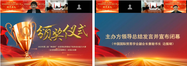 12月17日全国总决赛结束后,中国国际贸易学会举行了线上颁奖仪式及赛项总结大会,中国国际贸易学会副会长兼秘书长边振珊会长做了总结发言并祝贺各获奖团队在本次大赛中的出色发挥,同时正式宣布开启筹备下一届“典阅杯”全国高校跨境电子商务综合能力大赛。