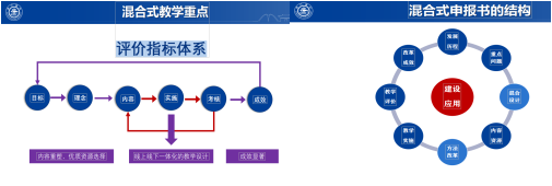 我国对于线上线下混合式目前的政策是大力倡导基于国家精品在线开放课程应用的线上线下混合式优质课程申报。报告主要从混合式教学重点和混合式申报书的结构为老师们提供申报指导。