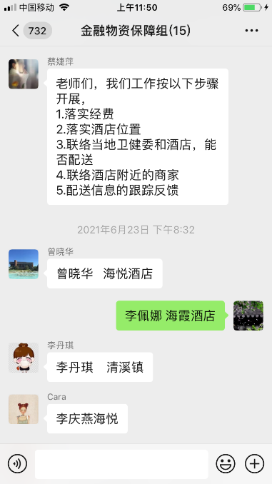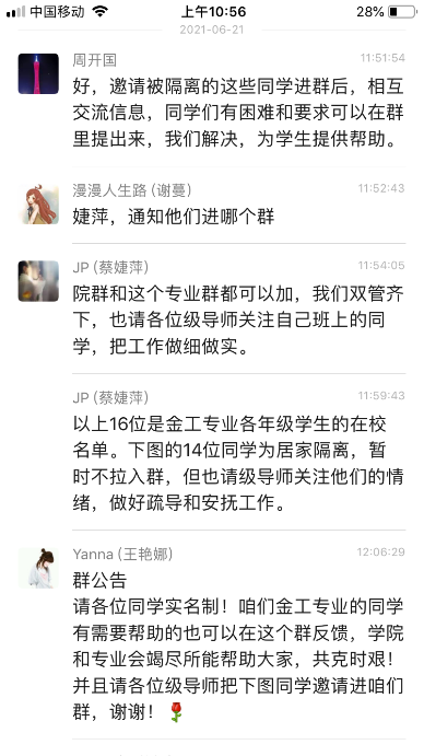 疫情发生的第一时间,在袁持平院长和周开国副院长的领导下,孔岩副主任、蔡婕萍副主任迅速组织金融工程和投资学专业的全体教师,召开抗疫专场会议。会议转达了学生隔离和封控的情况,摸排校外酒店隔离学生需求,反馈校内封控学生意见。随后领导和老师们迅速行动,专人对接隔离学生,关爱学生物资需求和心理状况,并采购物资为学生送去老师们的爱心。