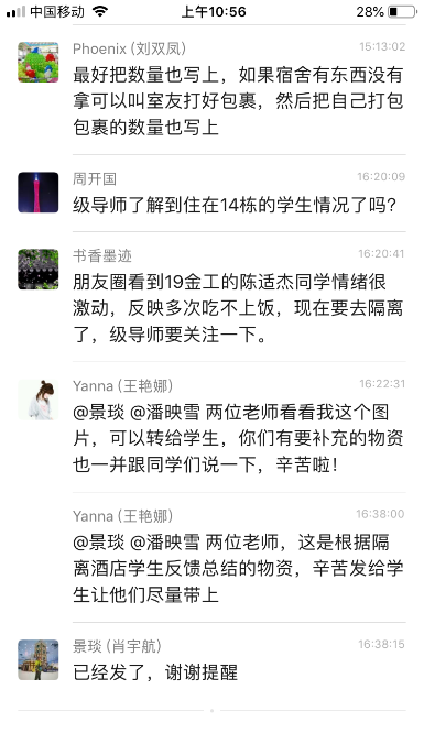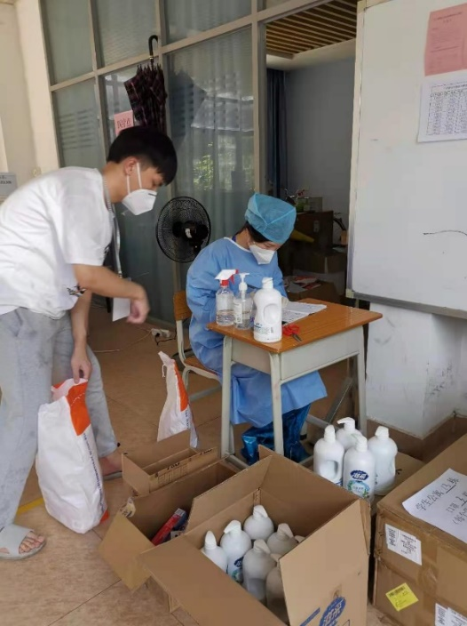 老师们在疫情初期就开始统计各栋宿舍学生的药物需求和物资需求。领导、老师和校友们为同学们募捐资金并采购了一批物资,以解决学生们的迫切需求。晚上学生表示已经收到了发放的物资,有方便面、水果还有温度计等,学生深深感受到了老师和校友们的关心,纷纷表示感谢。