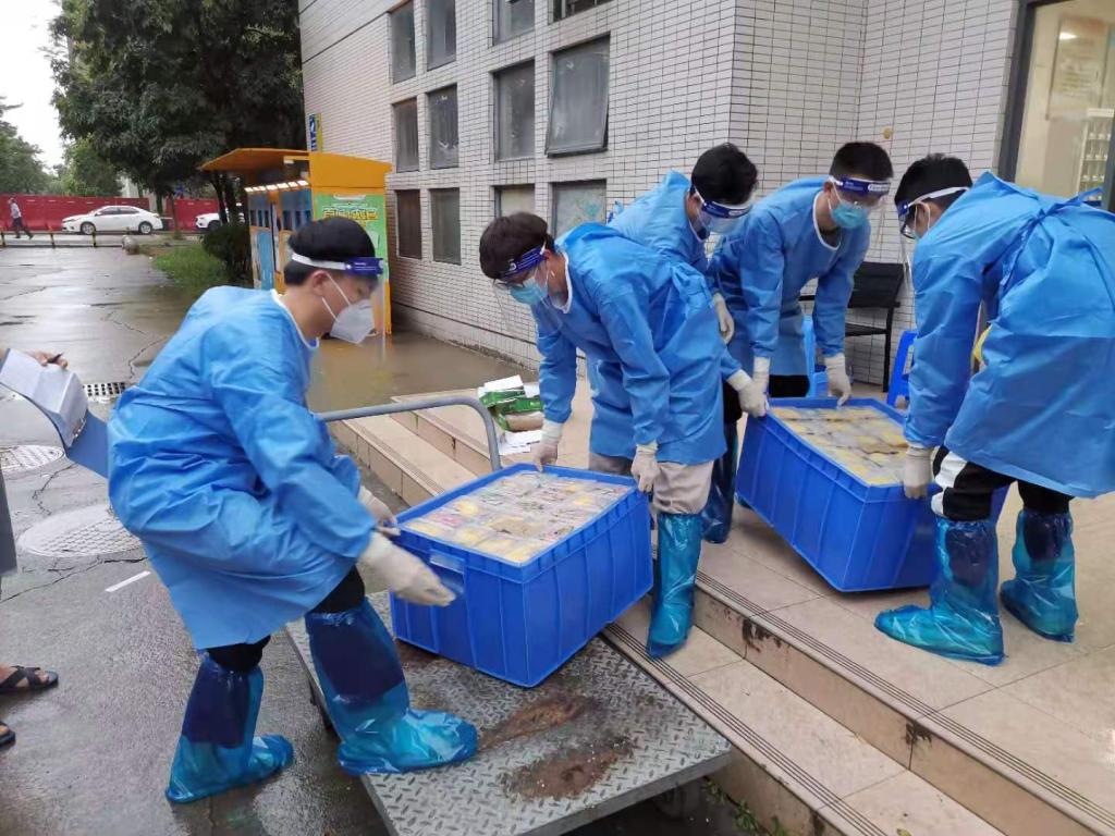 他们组织人员负责学生的一日三餐,在没有电梯的宿舍逐层爬楼为学生送餐。在东莞酷热的天气之下,不一会儿防护服里面的工作人员就全身湿透。