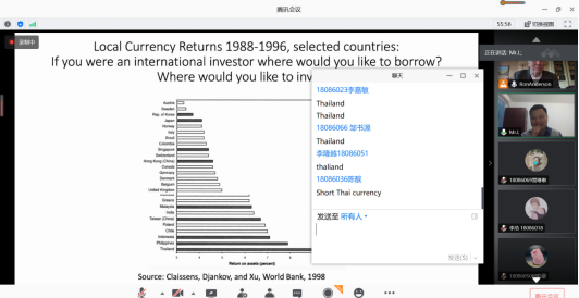 随后,Ron Anderson 教授简要介绍了1997年东南亚金融危机的情况。他提到导致包括泰国,菲律宾,韩国等东南亚国家,在上世纪90年代,经济大幅波动的原因。包括过度解放资本的管控,以及允许投资者在其本国从事具有高杠杆风险的投资。因此,大量投资者开始对这些东南亚国家的货币做套利交易,当这些货币受到过分追捧的时候,就带来了虚假繁荣以及投机泡沫。之后,外汇市场出现恐慌,投资者纷纷抛售手上的货币来兑换美元,美元升值,而东南亚各国货币大幅贬值,这直接引发金融危机。Ron Anderson 教授还推荐了当年狙击泰铢的投资者乔治·索罗斯的著作《金融炼金术》,帮助同学们更好地了解当年金融危机的历史背景。