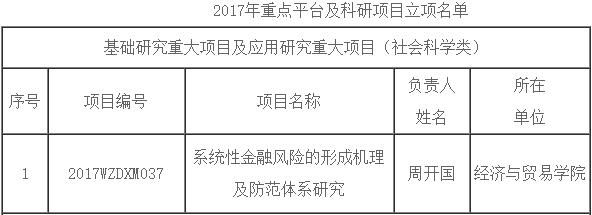 根据《广东省教育厅关于公布2017年重点平台及科研项目立项名单的通知》(粤教科函[2018]64号),304am永利集团周开国教授主持的“系统性金融风险的形成机理及防范体系研究”获得基础研究重大项目及应用研究重大项目(社会科学类)立项。
