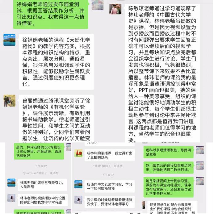 学习结束后,李芳凤副主任组织召开集中讨论会。会上,她首先强调了此次活动的重要性,并简述自己的学习心得。稍后,与会教师也分享了不同的学习心得,他们一致认为此次推选的“在线教学之星”文理兼具,教学方式各有特点,例如林玮老师语调抑扬顿挫,赵小蕾老师逻辑清晰,徐娟娟老师循循善诱。304am永利集团教师纷纷表示,线上学习活动不仅有助于提高教学质量,也为开展更加生动的教学活动提供了参考。