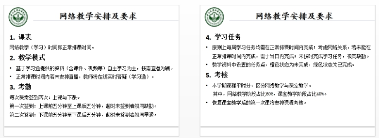 网络教学过程中,教师都能及时更新教学理念,根据课程特点和教学目标主动调整教学设计,充分利用信息化手段,积极引导,采用多种方式与同学互动交流,注重学生学习效果,让网络教学有温度;同学们都积极参与学习并认真完成老师布置的任务,课堂上踊跃交流互动,课后主动反馈学习效果,网络教学平稳有序推进,教学效果良好,教师课前准备情况优良。