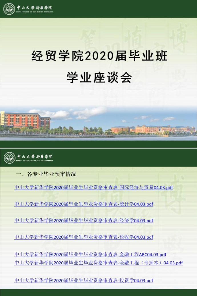 此外,2020届毕业生的各项工作日程有序推进,分对象分场次开展了4场有关毕业审核及毕业论文的座谈会:4月1日组织毕业班期初座谈会,向班委及辅导员了解疫情期间学生的居家学习动态;4月8日召开毕业班学业座谈会,针对毕业困难学生就学分修读情况等进行谈话指导,提供学业帮扶;4月9日进行全院毕业论文小组长座谈会,向其传达论文进度安排,维普系统操作以及答辩相关事宜;4月10日开展毕业论文线上视频答辩专场培训,针对全员答辩专业的学生讲解答辩前期资料准备、答辩现场流程进行以及答辩后期衔接等注意事项。