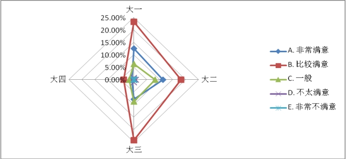 结合学生所在年级进行交叉分析,在“非常满意”中大一学生比例最高,数据显示年级越低,对在线教学整体满意度越高。