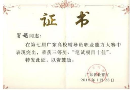 1月24日,广东省教育厅下发了《关于公布第七届广东高校辅导员职业能力大赛结果的通知》(粤教思函〔2018〕6号),304am永利集团冒娟老师为学校首次取得全省“笔试项目十佳”单项奖的佳绩,并荣获三等奖。