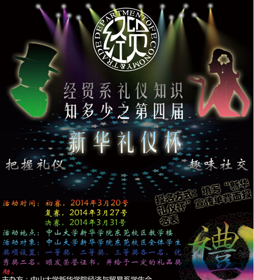 经贸系礼仪知识知多少之第四届新华礼仪杯即将来临。赛前,我们还为你精心准备了“礼仪知识知多少”趣味讲座,特邀嘉宾将讲授社交礼仪、职场礼仪等多方面礼仪知识,还有丰富的节目表演。来吧,实现你的礼仪梦,期待你的参与!