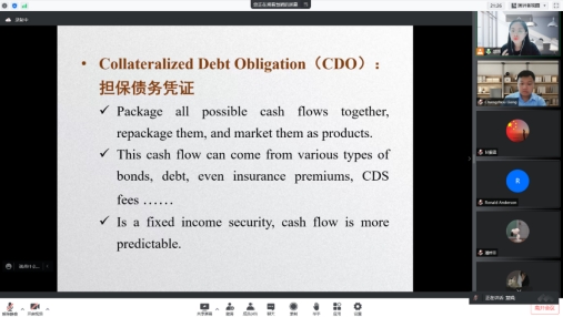 课程伊始,周慧娟老师向同学们介绍了一些相关金融术语对应的英语词汇,例如financial innovation、credit default swaps、mortgage back securities、special purpose vehicles等,并与之前课程中提到的知识点相联系。