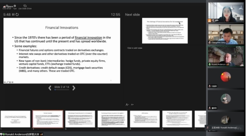 随后,Ronald Anderson教授介绍金融创新的相关内容。教授提到,自20世纪70年代以来,美国历史上存在一段金融创新的时期一直持续到现在,并蔓延到世界各地,例如在衍生品交易所内交易的金融期货和期权合约,在场外交易市场交易的利率互换和信用违约互换(CDS)、抵押贷款支持证券(MBS)以及其他许多衍生品。并且教授还提到,这些新的金融产品大大增加了金融风险的交易和分担方式,给风险管理和监管带来了一定的挑战。