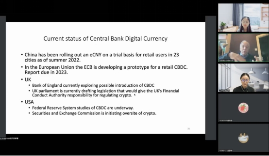 Anderson教授还提到货币的交易媒介、贮藏手段、价值尺度等职能,以及商品货币的优点和缺点、法定货币成功的原因等。Anderson教授提出了“加密货币的优势能否在稳定的环境中保持”这个疑问,引出了中央银行数字货币(CBDC)的作用,并为同学们介绍了中央银行数字货币在不同国家的发展现状。