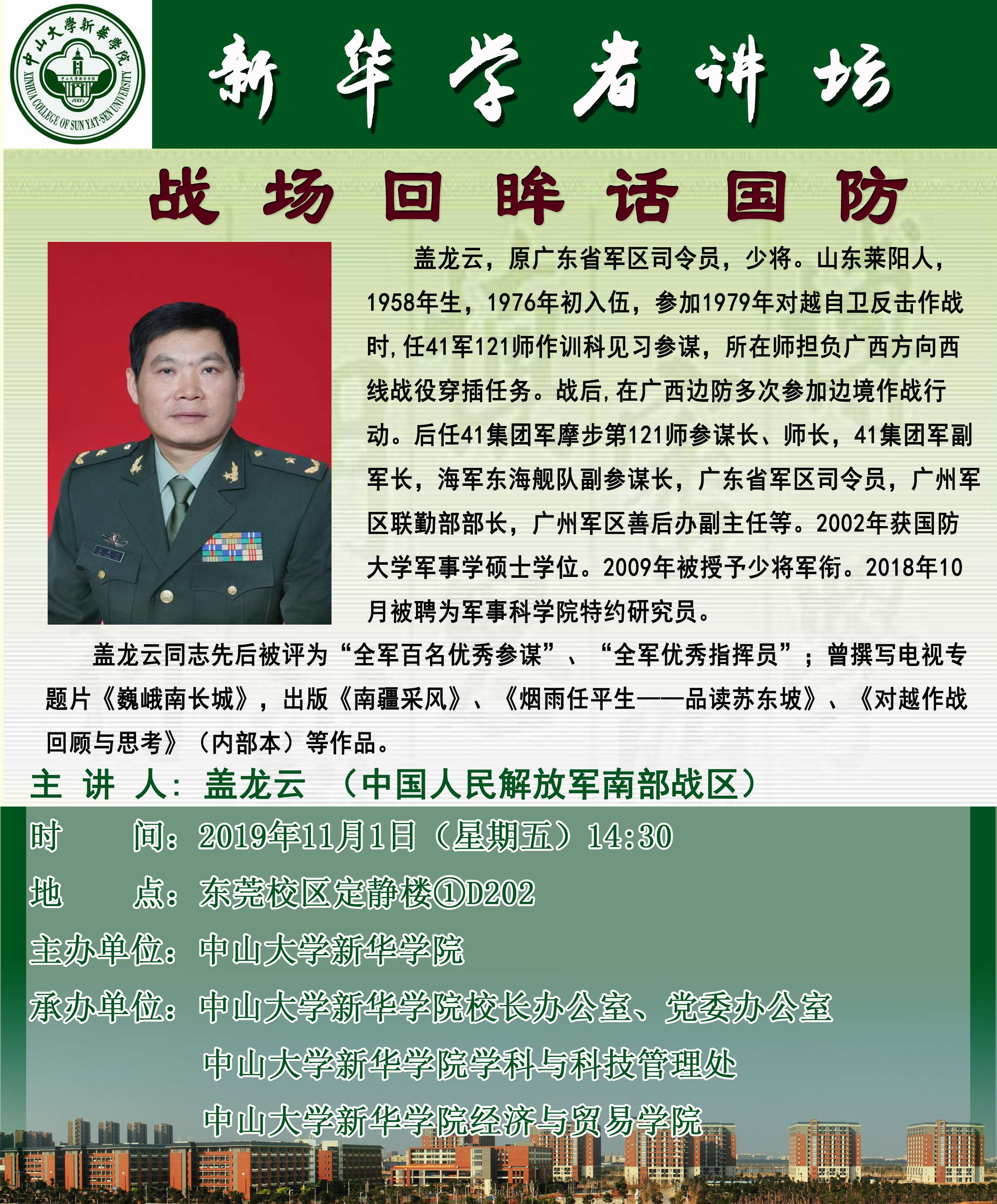 主 讲 人:盖龙云(中国人民解放军南部战区)讲座时间:11月1日(星期五) 下午14点30分讲座地点:东莞校区定静楼①D202课室主办单位:中山大学新华学院承办单位:中山大学新华学院校长办公室、党委办公室 中山大学新华学院学科与科技管理处