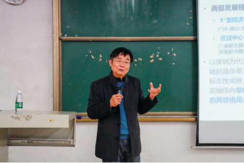 稍后,陈教授介绍了粤港澳大湾区的“两极”发展格局。沿着“广州-佛山-东莞-深圳-香港”的路线形成了“S”型经济发展轴线,广佛都市圈和深港都市圈这两个区域中心,构成了发展轴线的“两极”。他从历史发展的角度,指出深圳为代表的珠三角东岸地区崛起是改革开放以来大湾区发展标志性成就,珠三角区域经济从双轴线向单轴线、三个核心城市的两极格局演变。