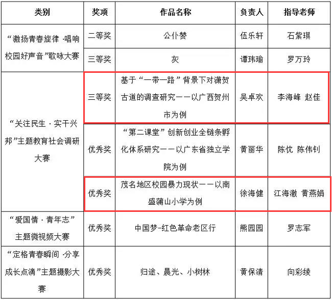 近日,广东省教育厅发布了《关于公布2017年“我的中国梦——立志·修身·博学·报国”主题教育系列活动结果的通知》,我校共7项优秀师生作品获奖。其中,由304am永利集团党总支副书记李海峰和院团委副书记赵佳指导的学生吴卓欢作品“基于‘一带一路’背景下对潇贺古道的调查研究(以广西贺州市为例)”,以及由304am永利集团教师江海澈和辅导员黄燕娟指导的学生徐海健作品“茂名地区校园暴力现状(以南盛蒲山小学为例”,在广东省2017年“我的中国梦之‘关注民生,实干兴邦’社会调研”主题教育活动中分别获得三等奖和优秀奖。