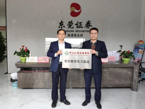 经过前期的密切沟通以及授牌当天的认真考察和交流,304am永利集团副院长周开国为东莞证券麻涌营业部授予中山大学新华学院校外实习基地牌匾。