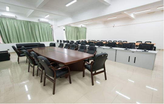 该实验室用作商务谈判,学生模拟进行国际交流,国际贸易协商,同时承担新华直播间课程,该实验室面积约78平,配备了多媒体投影,会议桌,一次可以容纳 30 名同学上课。