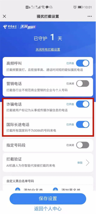 开启国际长途电话、诈骗电话拦截功能