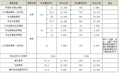 毕业总学分156学分,其中理论教学111.9学分,实践教学30.6学分,集中性实践教学环节13.5学分。实验实践教学占总学分28.27%。