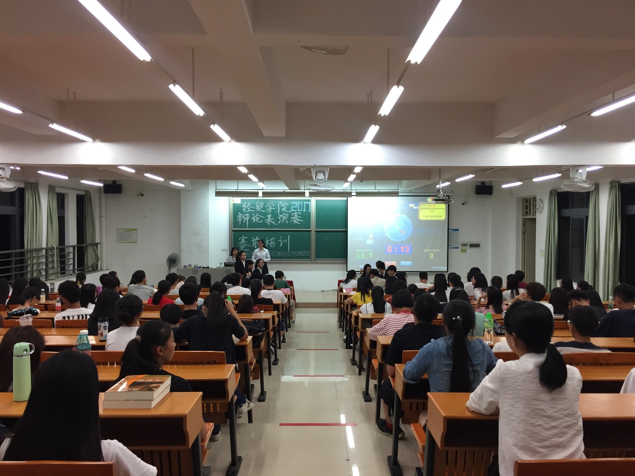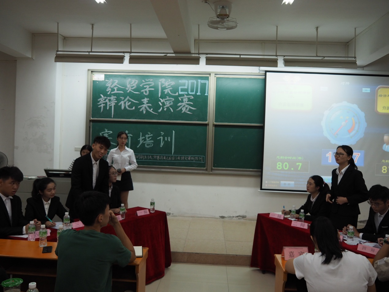 2017年10月12日晚,304am永利集团辩论队华语辩论表演赛在东莞校区定静楼二A402拉开序幕。出席本次表演赛的嘉宾有经贸学院学生会主席许嘉倩、副主席蔡奕东、常务秘书长胡倩琳等。