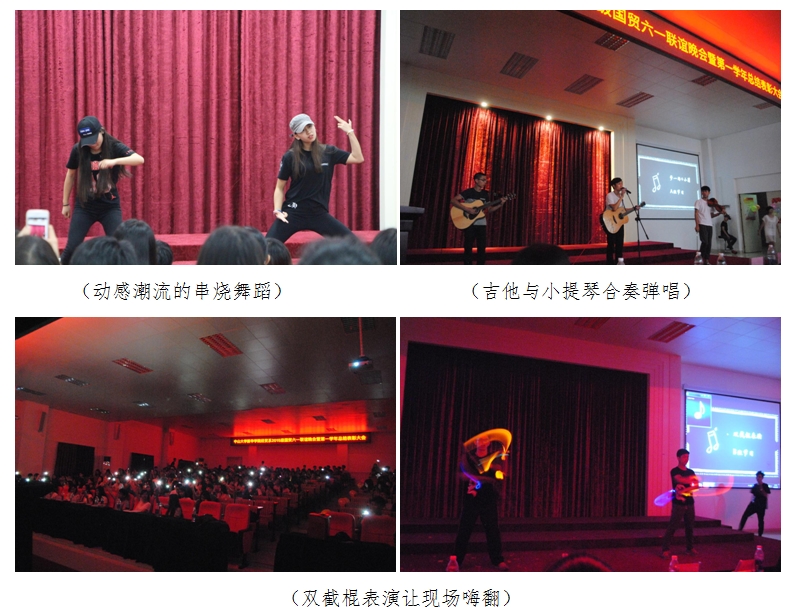 游戏结束之后,由15级国贸C班别锦瑾和徐嘉琪同学带来的串烧舞蹈将现场气氛带动了起来,活跃的舞姿引得掌声如雷。而后, A班同学陈杰坤用吉他与小提琴合奏弹唱《小莉》和《梦一场》,动听的旋律深深吸引着在场的同学们;彭家杰同学深情独唱《天梯》,深情的独特音色和轻快的节奏引起一阵阵掌声;B班同学郑楚鸿和马声绵带来的双截棍表演,结合动感的音乐,更是让现场嗨翻。一个个洋溢着青春气息的节目将现场气氛推动到一个个热潮当中。