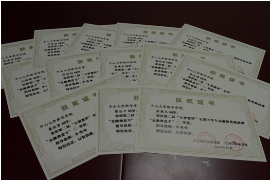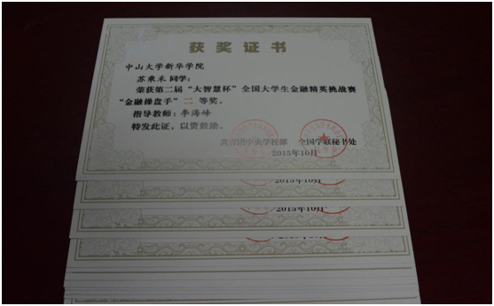 为推动青年学生“金融创业梦”计划,搭建金融界产学研交流合作平台,共青团中央学校部、全国学联秘书处于2015年举办第二届“大智慧杯”全国大学生金融精英挑战赛。中山大学新华学院“大智慧杯”全国大学生金融精英挑战赛由共青团中山大学新华学院委员会和经济与贸易系主办,经济与贸易系学生会承办组织。10月23日,第二届“大智慧杯”全国大学生金融精英挑战赛终于落下帷幕。经贸系硕果累累,其中,选手冼晓君和苏乘禾两位同学获得全国“金融操盘手”二等奖,詹佳贤、潘明丽等10位同学获得全国“金融操盘手”三等奖。