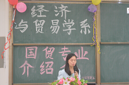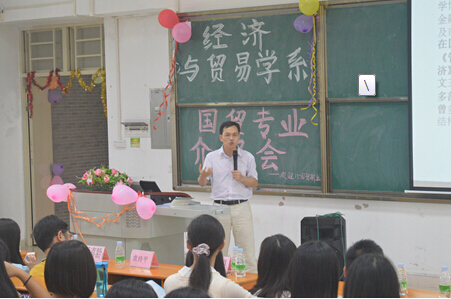 在另一个课室,经济学的专业介绍会也在进行中。经济学专业主任方建国介绍了经济学专业的历史沿革以及未来发展趋势,剖析了经济学在金融业以及社会上的重要性。他用亲身经历告诉新生们学习经济学的必要性,并介绍专业未来的改革方案,全方位比较经济学专业中应用经济、会展经济与低碳经济三个不同方向的教学特色以及专业知识的侧重点。此外,方主任教导新生们要具备正确的学习态度,并寄予很大的期望。