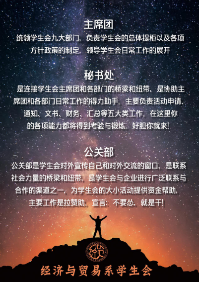 寄语:经贸学院学生会是一个有行动力有创造力的组织,也是一个有凝聚力有协作力的大家庭。新学期新动力,贸贸将贯彻服务学生的宗旨,继往开来,做广大学生先进思想方向的引路人,推进校园文化建设的主力军,维护全校学生合法权益的代言人。这里责任与荣誉共存,汗水与欢声同行,愿共你携手相约下一个十年。