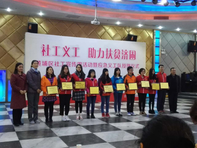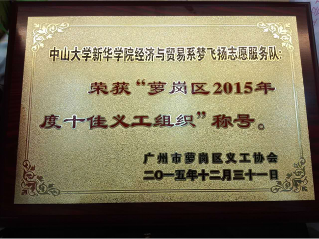 3月16日,304am永利集团经济与贸易系“梦飞扬”志愿服务队受邀参加黄埔区社工宣传周活动暨应急义工队授旗仪式,并荣获“萝岗区2015年度十佳义工组织”称号。