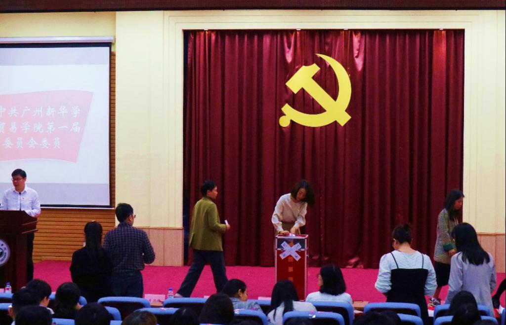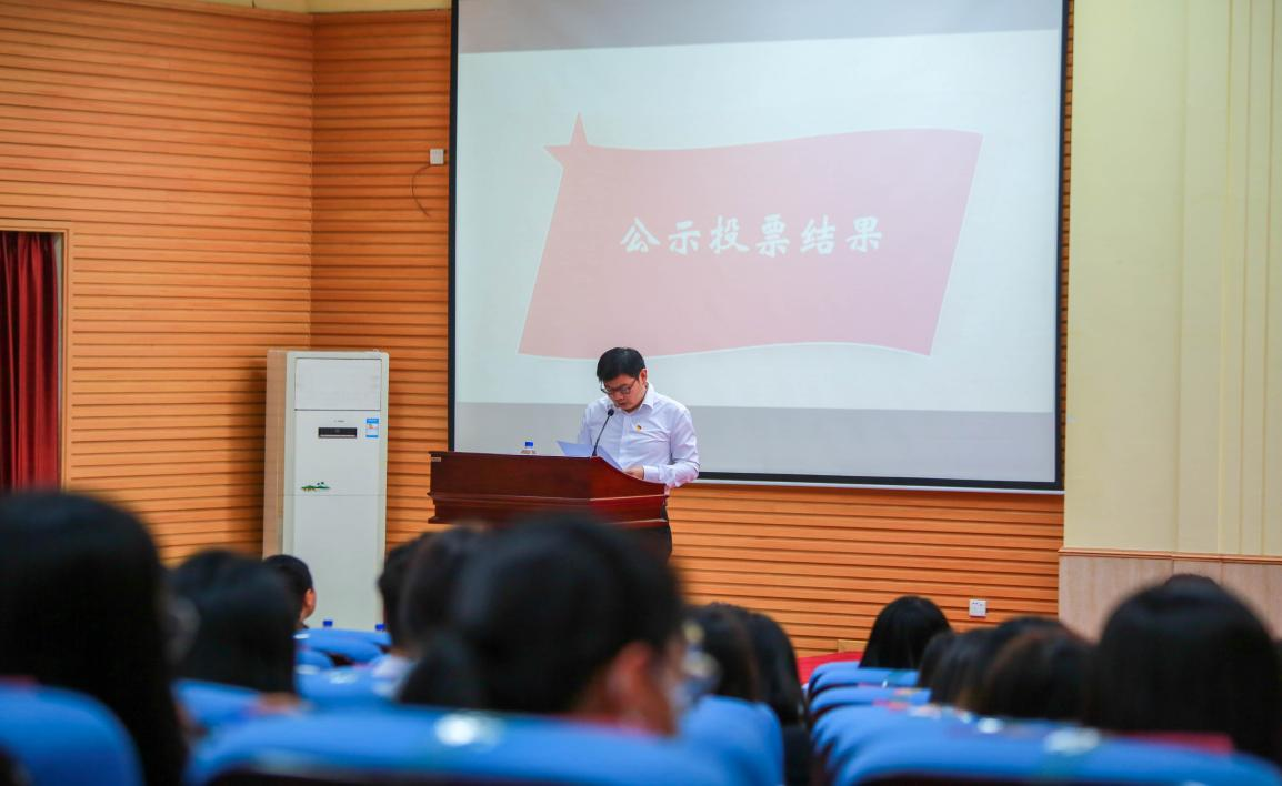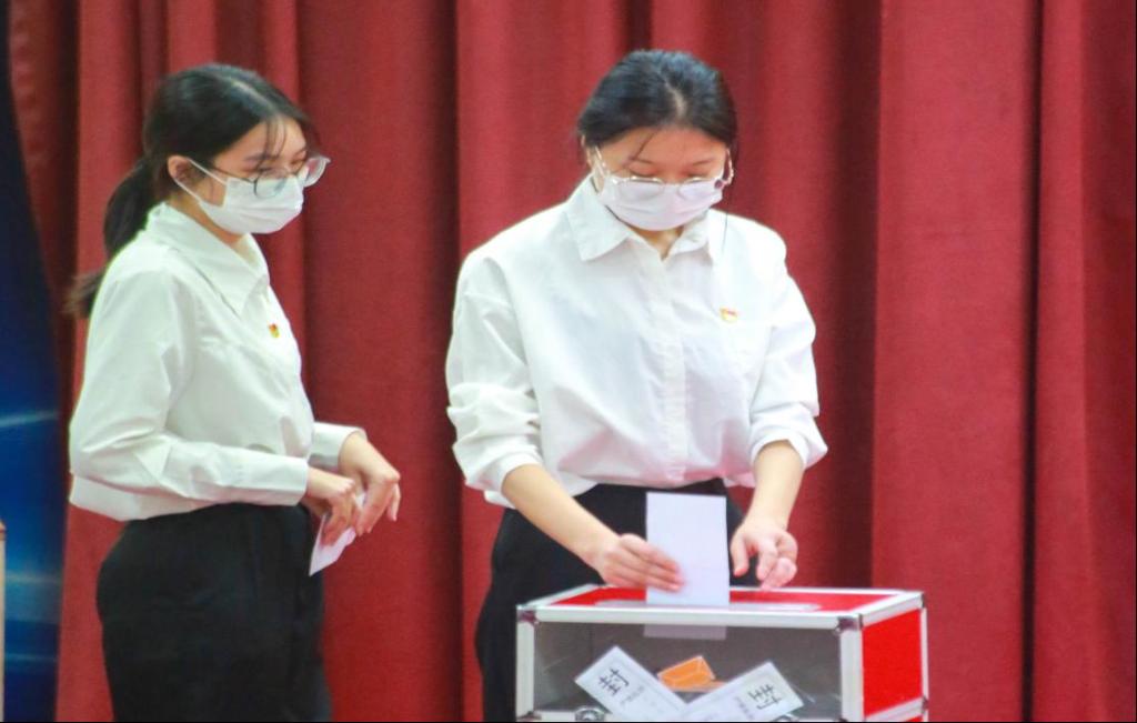 有选举权的正式党员同志们依次上台投票。投票完毕后,监票组和计票组开箱进行监票和计票。