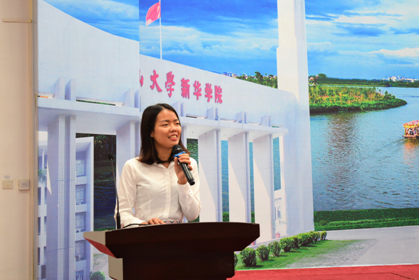 图:国贸专业副主任吴喜龄(左)、14级优秀学生党员丁诗诗(右)在专题会议上分享十九大报告学习体会